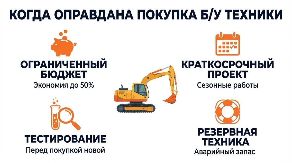 Сезонные или разовые работы — например, компания получила заказ на земляные работы на три месяца. После этого техника не нужна. Б/у экскаватор, который потом можно продать, имеет смысл.